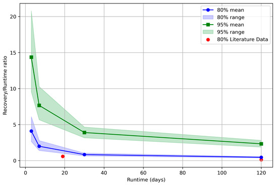 - Beyond 30 days of runtime, the decrease in recovery/run ratio to achieve 80% recovery slows, indicating a potential “sweet spot” for designing operational schedules.