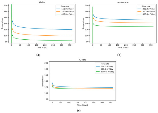 Three working fluids, water, n-pentane, and R245fa, were investigated as candidates for sub-critical Organic Rankine Cycle (ORC) applications. For water and n-pentane, wellbore initialization was performed by equilibrating the fluid with the surrounding formation to establish a realistic thermal distribution prior to flow. However, for R245fa, equilibration caused convergence challenges in the numerical model and was therefore omitted. Instead, several initial wellbore temperatures were prescribed to test model sensitivity. Despite these differences, all R245fa cases converged after the first 24 h of simulation, and outlet temperature histories collapsed into a single trajectory for each flow rate. Accordingly, the first 24 h of R245fa results are not reported. For each fluid, three volumetric flow rates were examined, with the corresponding temperature-time responses shown in Figure 9a–c. For water (Figure 9a), flow rate strongly influences the outlet temperature: lower flow rates maintain higher temperatures due to longer residence time, while higher flow rates cool more rapidly. In contrast, n-pentane (Figure 9b) exhibits similar early-time behavior but stabilizes at higher long-term outlet temperatures than water. Although the flow-rate cases for pentane are not directly comparable to those of water, the trend still shows a weaker sensitivity to flow rate relative to water. Finally, R245fa (Figure 9c) shows the weakest dependence on flow rate. The outlet-temperature curves collapse into a narrow band, indicating that the long-term thermal behavior of R245fa is governed primarily by its thermophysical properties, rather than by operational changes in the investigated flow rate range.