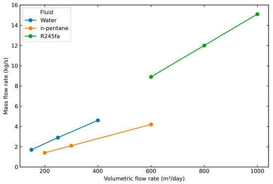 Mass flow rate (kg/s) versus volumetric flow rate (m3/day) for the working fluids.