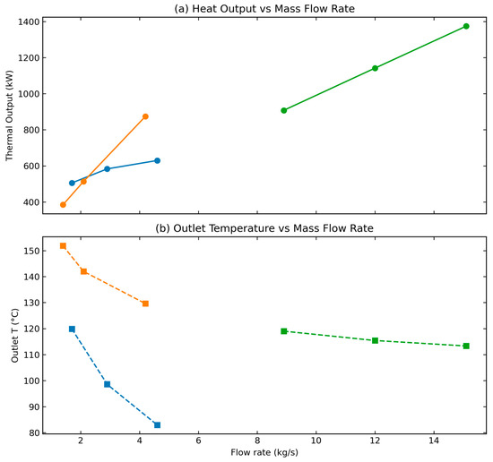 To account for density effects, Figure 10 presents the relationship between volumetric and mass flow rates, enabling comparison of the three fluids on a consistent mass basis. Flow rates were chosen to maintain outlet temperatures within the sub-critical ORC range while avoiding near-critical conditions for n-pentane and R245fa, ensuring reliable property calculations for density, enthalpy, and viscosity. Under these conditions, both the alkane and the refrigerant delivered higher thermal outputs than water (Figure 11). In addition, they offer the advantage of direct integration into an ORC without the need for a surface heat exchanger.