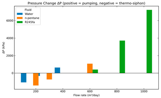 Figure 12 illustrates the pressure differences between inlet and outlet flows. At lower flow rates, water and n-pentane showed thermo-siphoning, promoting natural circulation and eliminating pumping requirements. At higher flow rates, pressure drops increased and pumping demands rose sharply, especially for R245fa. These results highlight the trade-off between thermal output and parasitic losses. Identifying an optimal operating window requires balancing heat delivery, outlet temperature requirements, and pumping costs to ensure efficient ORC power generation.