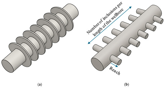 Two geometries of interest for conductive inclusions are ring-shaped and fishbone-like structures; for more information on the latter, see [20]. Ring structures, potentially created via hydraulic stimulation, extend radially from the wellbore, while fishbones, often associated with acid stimulation, extend laterally (Figure 2). Beckers et al. [21] modeled these geometries using COMSOL, showing that thermal output increases linearly with the number of thermal enhancements. Assuming the enhancer material possesses a conductivity 1000 times that of the rock, rings provided modest thermal gains (0.7% for five discs in a 1000 m wellbore), while fishbones (10 m long with the 4 equally spaced enhancements along a 10 m lateral) achieved up to 20% improvement in the thermal power under favorable configurations.