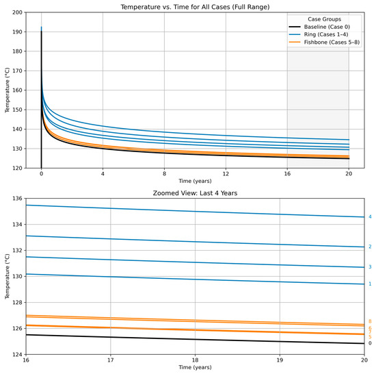 This Outlet temperature over 20 years for all enhancement cases. Top: full trajectory for baseline (black), ring cases 1–4 (blue), and fishbone cases 5–8 (orange). The conductive enhancements are applied to the bottom 400 m of the wellbore reaching 5–10 m radius around the borehole.