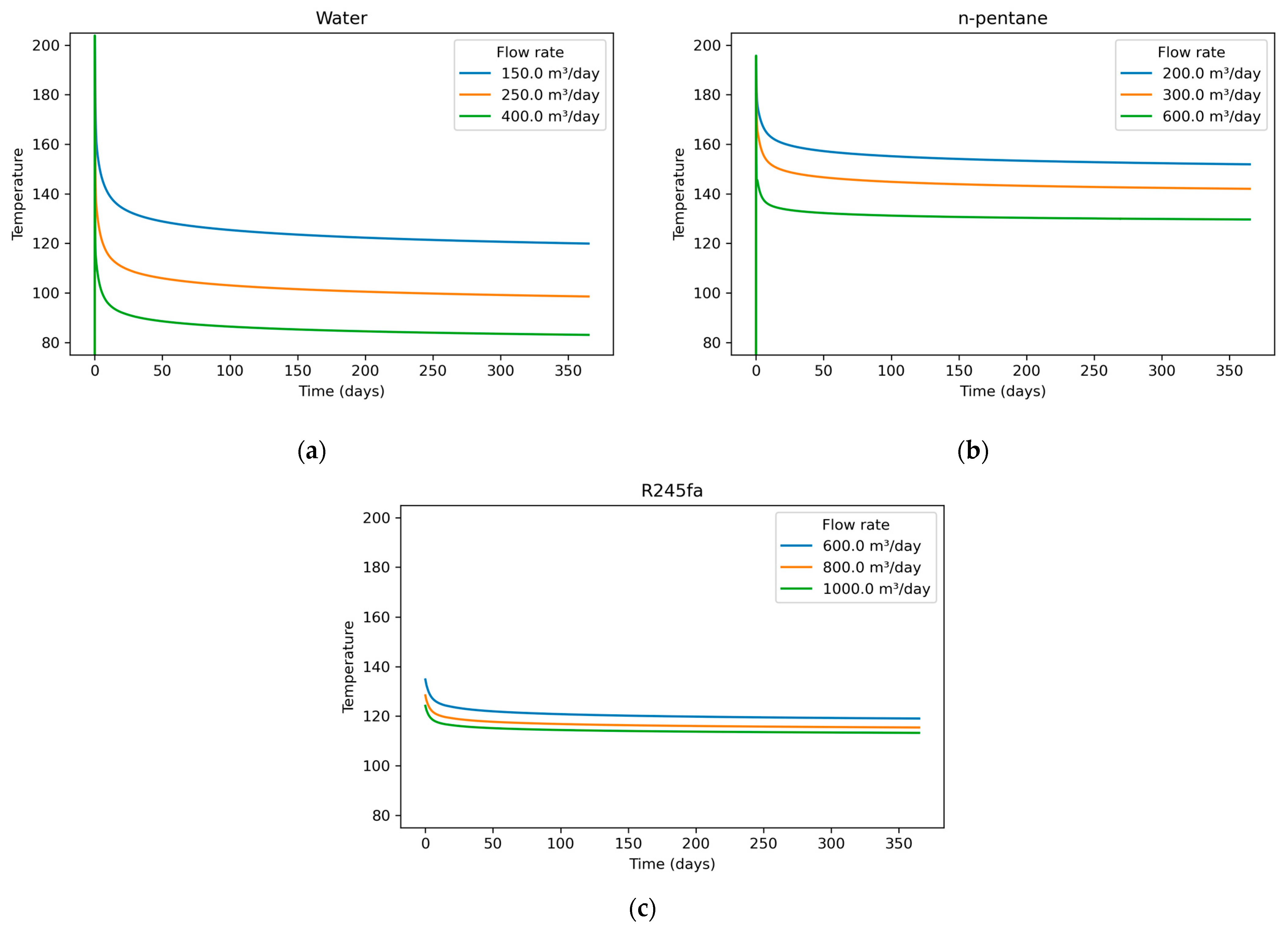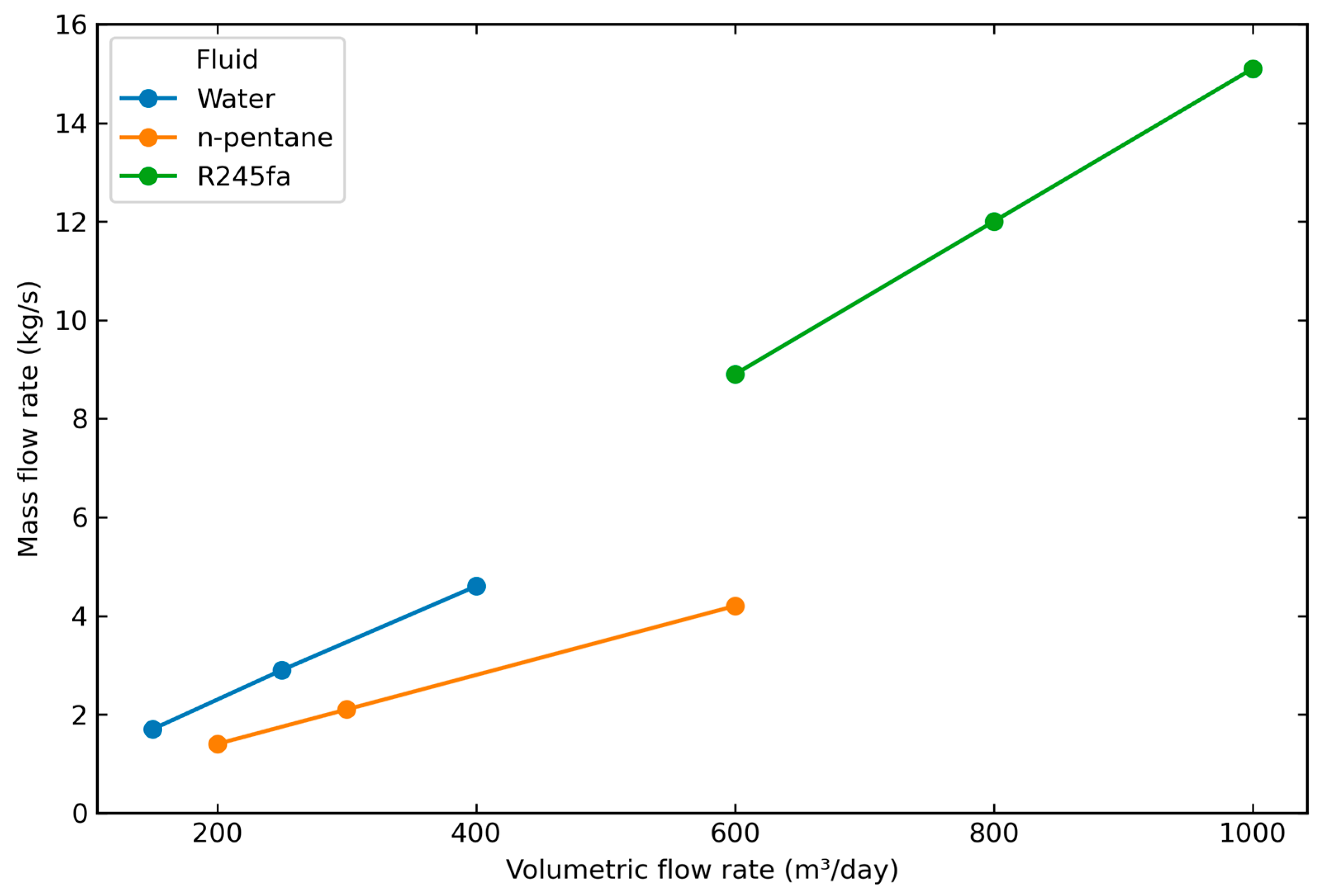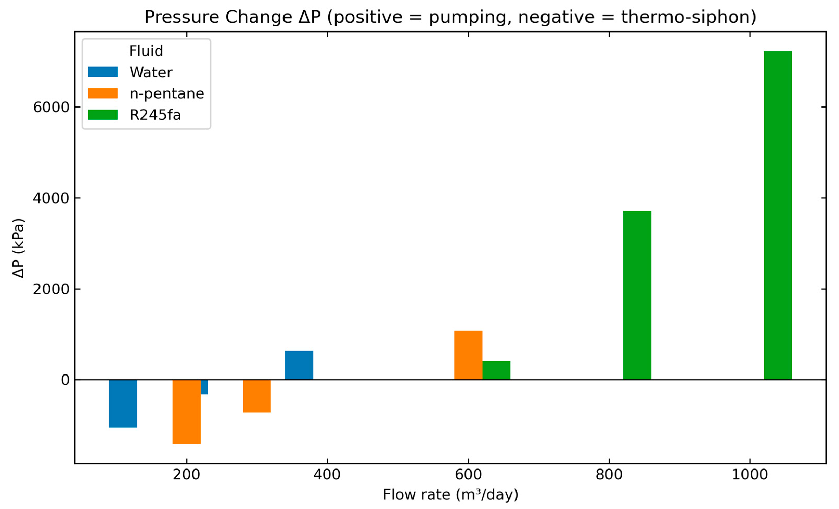 - Working fluids. Within the sub-critical ORC temperature range, n-pentane and R245fa deliver higher thermal output than water and allow direct ORC coupling without a surface heat exchanger. However, hydraulic penalties and safety/climate considerations introduce trade-offs. Thermo-siphoning at lower flow rates for water and n-pentane suggests potential for eliminating pump requirements, while higher flow rates increased pressure drops sharply, particularly for R245fa. The Joule–Thomson sign change for n-pentane and R245fa above ~80–100 °C underscores the importance of tracking along-wellbore pressure-temperature paths in design and operation;