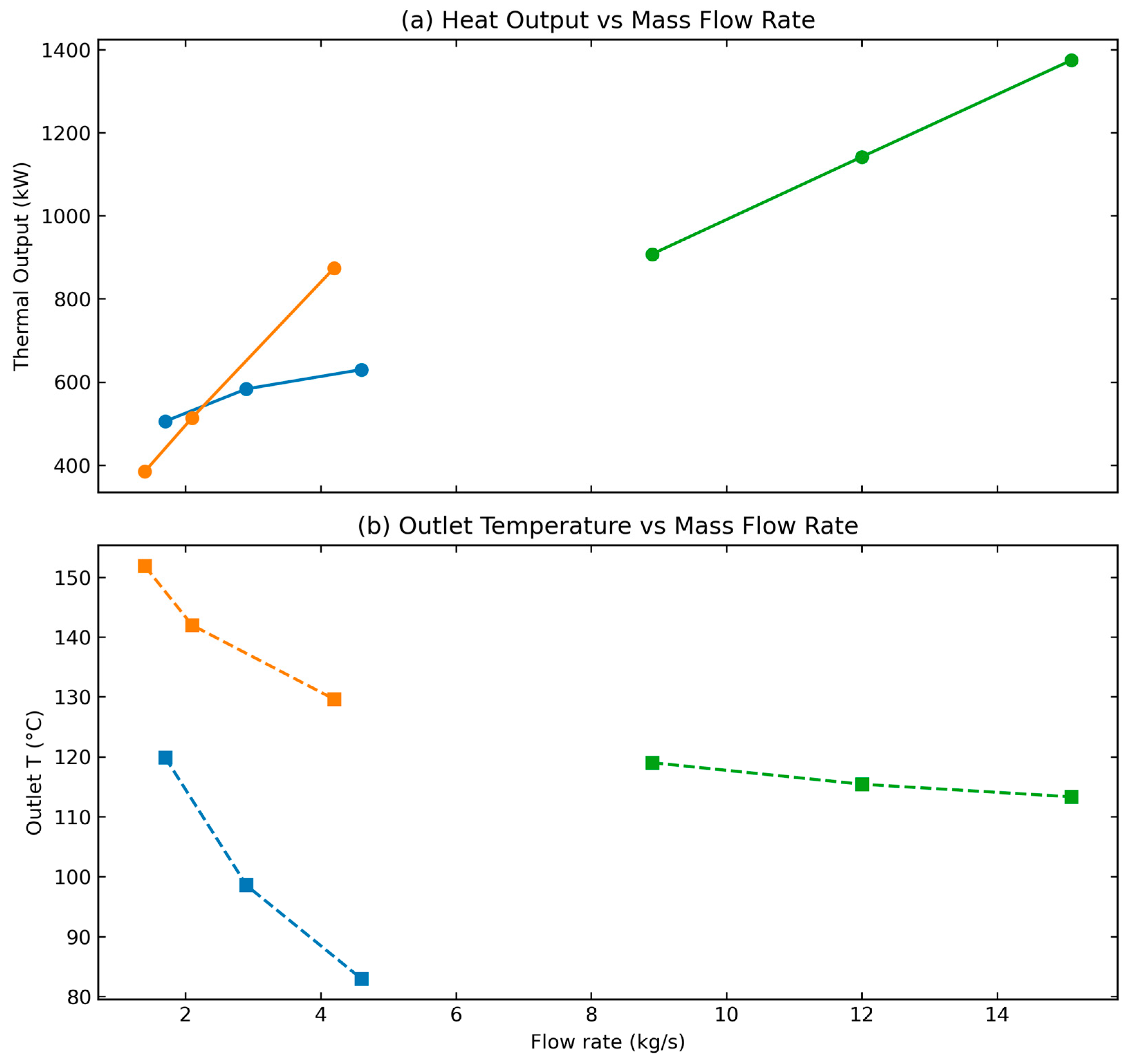 - Intermittent operation. Longer recovery windows raise outlet temperatures and average delivered heat but with diminishing returns. The proposed characteristic recovery curve (recovery/run vs. run length) indicates ~80% recovery as a realistic design point for shorter cycles, whereas 95% recovery is operationally prohibitive except for longer seasonal shut-ins. Formation properties shift the curve in predictable ways: higher thermal conductivity and lower heat capacity shorten recovery times. Flow rate effects were negligible within the tested range;