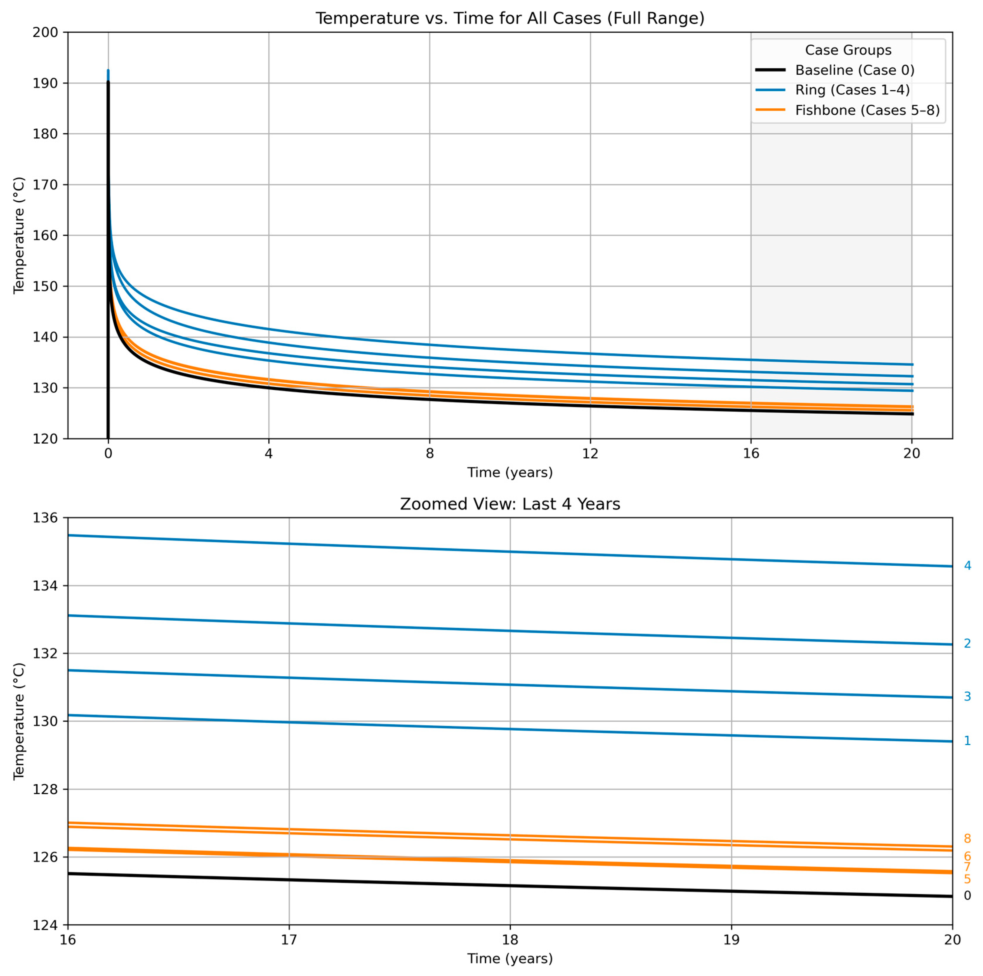 - Conductive enhancements. Ring architectures outperform fishbones due to their greater capacity for injected volumes and higher effective conductivity. After one year, rings yielded ~4.5–9.4% gains in outlet temperature (vs. ~0.65–1.37% for fishbones); after 20 years, gains remain at ~3.7–7.8% for rings (vs. ~0.55–1.18% for fishbones). Performance scaled approximately linearly with injected volume fraction for both geometries. Reach further amplified performance, with rings showing ~20–25% relative improvement when extended from 5 to 10 m, compared with ~5–10% for fishbones.