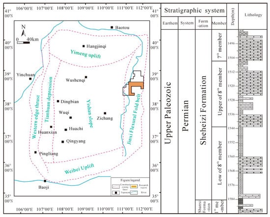 The Upper Paleozoic stratigraphic succession in the study area includes, in ascending order, the Benxi, Taiyuan, Shanxi, Lower Shihezi, Upper Shihezi, and Shiqianfeng formations. The target reservoir, the He 8 Member of the Lower Shihezi Formation, is in direct contact with underlying coal-bearing source rocks and is sealed by regionally extensive mudstones. These elements collectively form an effective source-reservoir-seal assemblage [15], providing favorable geological conditions for tight sandstone gas accumulation.