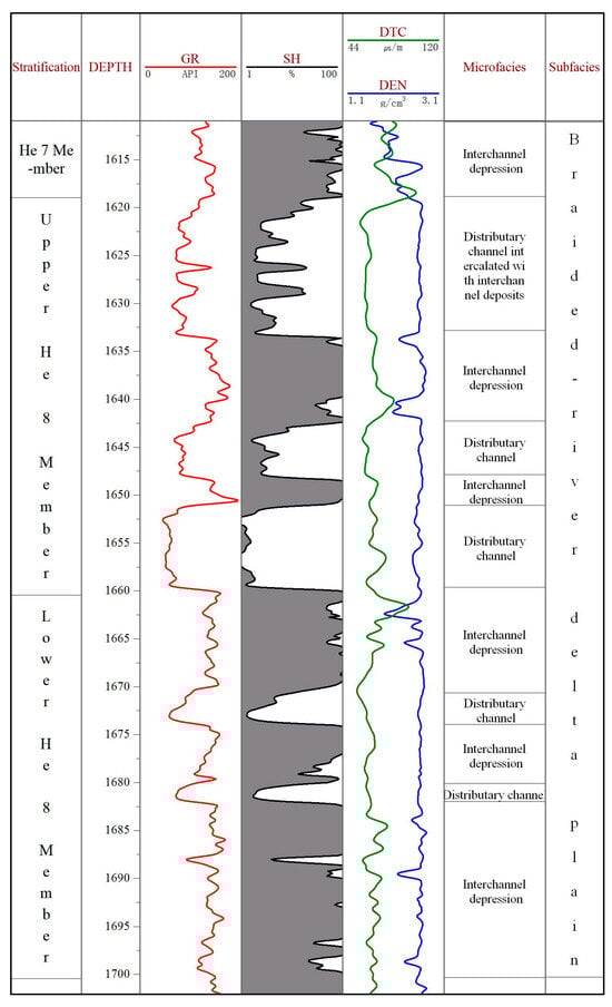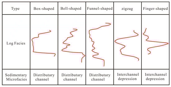 Log facies analysis provides a critical bridge between geophysical responses and sedimentological characteristics. Based on established principles of log facies interpretation, this study systematically analyzed the shape, amplitude, contact relationships, and stacking patterns of log curves to identify and classify sedimentary microfacies within the He 8 Member. Previous studies have confirmed that the Lower Shihezi Formation in the Linxing area developed within a braided-river delta plain system [22]. Integrating established log facies models for this depositional environment [23,24,25,26,27,28,29], this study defined the following identification criteria (Figure 2): the braided-river delta plain subfacies typically exhibits log patterns characterized by vertical stacking of multiple box- or bell-shaped curves. The natural gamma ray (GR) curve for the distributary channel microfacies generally displays medium- to high-amplitude, slightly serrated bell or box shapes, forming positive or composite rhythms. In contrast, the interchannel microfacies, characterized by higher clay content, typically show low-amplitude, highly serrated finger-like or zigzag GR curves, which often intercalate with thin sandstone layers exhibiting finger-like log signatures.