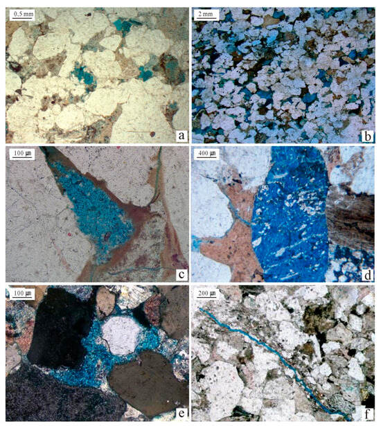 Pore types of He 8 Member reservoir in central Linxing area, Ordos Basin. (a) Intergranular pores (Well L36, 1830.14 m). (b) Intergranular dissolution pores (Well L37, 1703.18 m). (c) Cement dissolution pores (Well L28, 1764.11 m). (d) Feldspar dissolution pores (Well S9, 1696.99 m). (e) Intergranular kaolinite intercrystalline pores (Well S9, 1674.17 m). (f) Microfracture (Well S9, 1676.16 m).