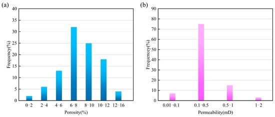 Porosity and permeability frequency distribution histograms of the He 8 Member in the central Linxing area, Ordos Basin. (a) Porosity frequency distribution histogram. (b) Permeability frequency distribution histogram.
