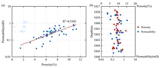 Porosity-permeability relationship and porosity/permeability versus depth profiles of the He 8 Member reservoirs in the central Linxing area, Ordos Basin. (a) Cross plot showing the porosity-permeability relationship; (b) Distribution of porosity and permeability with depth.