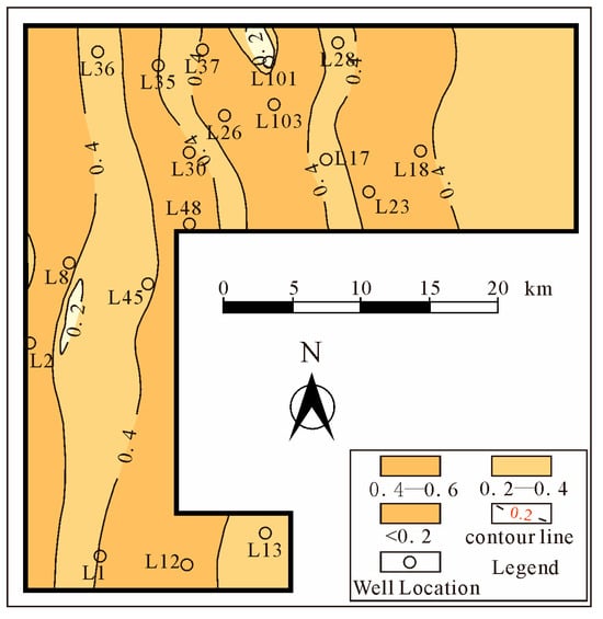 The sand-to-mud ratio serves as an effective indicator for assessing sandbody development, analyzing sedimentary microfacies distribution, and inferring sediment provenance. Differences in its value reflect variations in depositional environment. Based on single-well and multi-well correlations combined with the sedimentary background, a sedimentary facies map of the He 8 Member was constructed (Figure 9), clearly illustrating the spatial distribution of sedimentary facies. The sand-to-mud ratio in the study area ranges from 0 to 0.6. Distributary bays exhibit a ratio of less than 0.2, channel flank deposits range between 0.2 and 0.4, and distributary channels have ratios exceeding 0.4. The main channel systems in the He 8 Member show a predominant north–south orientation, with distributary channels and channel flanks comprising the dominant facies. Due to strong basal scouring by distributary channels and their frequent lateral migration, original distributary bay deposits are rarely completely preserved.
