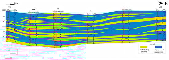 The depositional setting and stacking patterns of sandbodies collectively govern their development scale and spatial architecture. An east–west-oriented cross-section, perpendicular to the paleo-transport direction (Figure 10), demonstrates that distributary channel sandbodies form the primary sandstone framework of the He 8 Member, showing large-scale development and characteristic braided-river depositional features. Vertically, channels exhibit significant inheritance, with multiple stories stacking to form a sand-enveloped-mud configuration. Although individual sandbody thickness is limited, frequent vertical stacking of sandstone lenses attests to multi-phase deposition. Within the vertical succession, the upper part of the He 8 Member displays smaller-scale channel development, thinner channel sandbodies, and poorer lateral connectivity. By contrast, the lower part exhibits better connectivity and larger individual sandbody dimensions. These differences are likely related to temporal variations in hydrodynamic energy and sediment supply during deposition, as well as to frequent lateral migration of distributary channels.