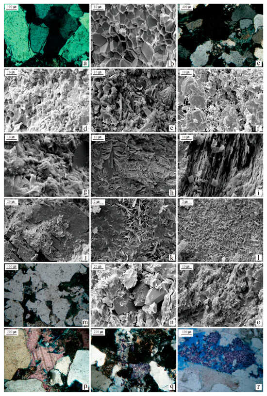Thin-section petrography and scanning electron microscopy (SEM) indicate that the carbonate cements in the He 8 Member are predominantly calcite and ferroan calcite, with minor ferroan dolomite and siderite. The primary cementation modes are basal and pore-filling. Thin-section observations reveal that calcite and ferroan calcite occlude intergranular pores or partially to completely replace detrital grains, with local dissolution remnants (Figure 12p,r). SEM analysis further shows calcite commonly associated with clay minerals, notably illite. Siderite typically occurs as brownish, microcrystalline aggregates filling primary intergranular pores (Figure 12q), suggesting an early diagenetic origin.