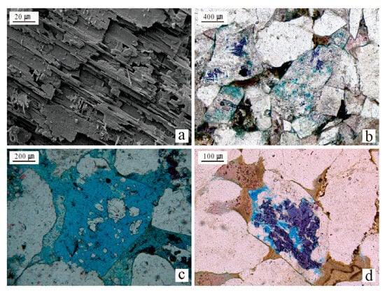 Siliceous cementation manifests mainly as secondary quartz overgrowths and authigenic quartz. Quartz overgrowth is widespread and predominantly grade I–II. Cast thin sections reveal that overgrowths develop on detrital quartz grains, displaying sharp boundaries with the host grains (Figure 12a). Clay rims are occasionally observed separating quartz overgrowths of different phases. SEM images show euhedral authigenic quartz crystals filling interparticle pores; in extensively cemented areas, quartz grains exhibit interlocking, mosaic-like texture (Figure 12b). Although siliceous cementation reinforces the mechanical compaction resistance of the rock framework, it considerably reduces porosity and permeability, thus representing a key factor in reservoir tightness.