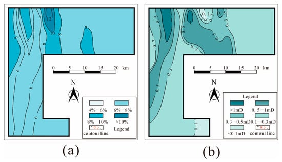 Petrophysical property distribution of the He 8 Member reservoirs in the central Linxing area, Ordos Basin. (a) Porosity distribution of the He 8 Member reservoirs. (b) Permeability distribution of the He 8 Member reservoirs.
