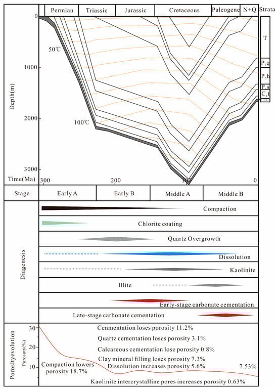 To unravel the dynamic densification process under the coupling of various diagenetic processes, the tightening history of the He 8 Member reservoirs is subdivided into three stages, based on an integration of thin-section observations, quantitative porosity analysis, and hydrocarbon charging history [39].