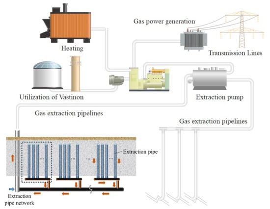 The extraction negative pressure has a significant impact on the gas extraction concentration and flow rate [13,14,15]. When the sealing quality of the borehole is constant, a higher extraction negative pressure may lead to a larger amount of gas leakage during the extraction process, resulting in a faster attenuation rate of extraction concentration. Air leakage can cause an increase in oxygen concentration, which can potentially lead to coal self-ignition and other disasters [16,17,18]. Conversely, if the negative pressure is too small, it may not overcome the resistance along the borehole and pipeline, potentially causing suffocation or blockage in the pipeline and borehole. This can lead to ineffective extraction or low extraction efficiency [19]. Scholars have studied the rules of extraction negative pressure. Cheng et al. [20] simulated and explored the impact of negative pressure on the extraction process by constructing a gas-solid coupled coal and gas model. Zhang et al. [21] studied the variation law of gas flow rate over time and pointed out that the effect of extraction negative pressure is more significant under negative pressure at the borehole mouth. Zhou et al. [22] introduced safety evaluation indicators for gas extraction and found that as the extraction pressure increases, the gas leakage inside the borehole also increases, leading to an increased accident rate and reduced extraction safety. Wang et al. [23] have identified factors affecting the extraction effect during negative pressure extraction and discussed the impact of extraction negative pressure on the early and late stages of extraction. Zhang et al. [24] conducted physical simulation experiments on negative pressure extraction and explored the rules by changing various parameter conditions during the negative pressure extraction experiment. Currently, the analysis of extraction hole negative pressure extraction is mostly based on boreholes, and systematic research is lacking. For research on pipeline networks, the current focus is mainly on ventilation networks [25,26] and natural gas networks [27]. There is limited research on the flow model and solution model of the gas extraction pipeline network, with most studies providing qualitative judgments but lacking quantitative research. The implementation of intelligent control in gas extraction pipeline networks can effectively enhance both gas concentration and extraction volume, ultimately achieving graded utilization of gas for applications such as heating, gas power generation, and regenerative thermal oxidation, as specifically illustrated in Figure 1.