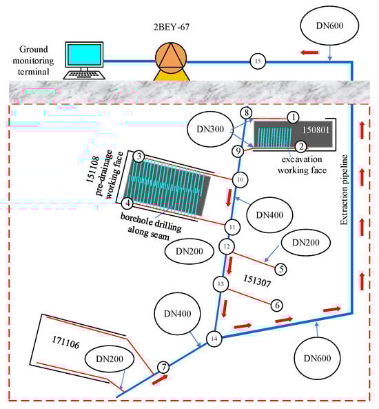 The gas extraction mixture enters the pipeline network, flows through the confluence of the branch main pipe, and is pumped out by the gas extraction pump.