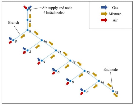 According to Formula (5), the network flow balance equation can be derived. Moreover, for a tree-like pipeline network, it is sufficient to know the flow at each gas source node and the flow at each branch node (where the flow at non-terminal and non-gas source nodes is 0) in order to determine the flow in each pipeline segment and the flow at the terminal node. Based on the actual conditions in the underground coal mine, the positions and lengths can be determined, and the gas flow can be used as the weight of the edges. By inputting this data into drawing software using computer programming, graphical results can be obtained.