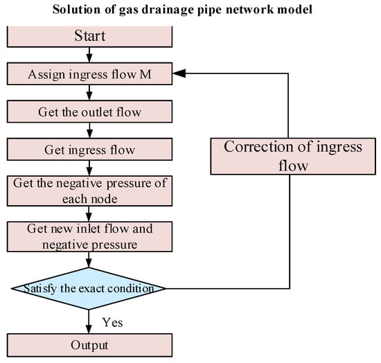 Based on the negative pressure at the drainage pump node and the pressure drops in each pipe section, the negative pressures at all nodes were derived. Using the negative pressure and flow rate boundary conditions at the suction inlet nodes, new flow rates and at the inlet ends were obtained. The flow rates at the inlet ends were then adjusted for balance correction, with the reassignment performed using the bisection method. The calculation accuracy was checked. If the requirements were not met, the originally assigned gas source end values were balance-corrected using the recalculated air-gas flow rates from the gas source end. The pipe section resistances and pressure losses were then computed again. This iterative calculation cycle was repeated until the accuracy requirements were met.