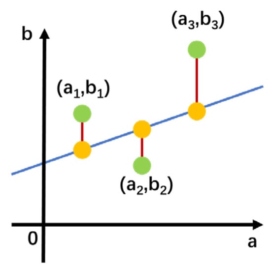 By substituting numerical values into the above system of linear equations, the parameter values of ‘a’ and ‘b’ can be solved, resulting in the solution for the fitting line as illustrated in Figure 6.