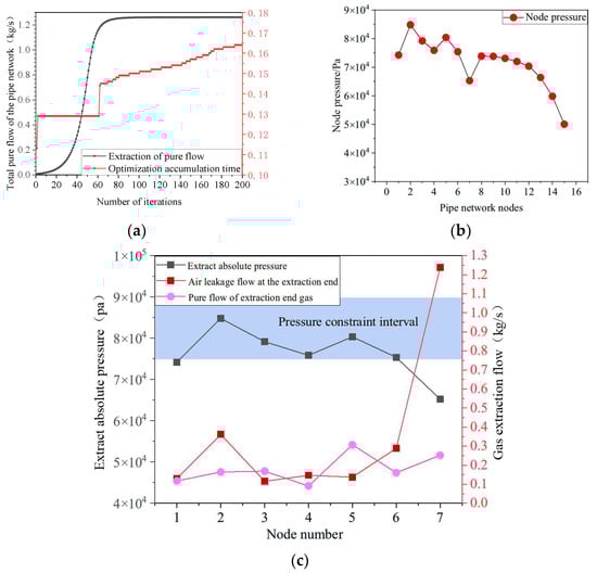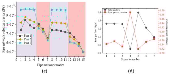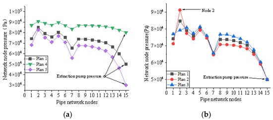 From the analysis of Figure 8a, it can be concluded that when increasing the gas extraction pump’s negative pressure, the negative pressure at all nodes in the network increases and vice versa.