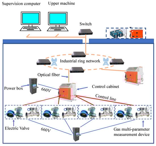 This paper adopts a combined approach of power control and resistance control to regulate gas extraction. In terms of power control, the overall regulation of the network is achieved by altering the negative pressure of the extraction pump. As for resistance control, valve adjustment is employed to alter the resistance of individual branches, facilitating localized regulation of the network. The specific control framework is illustrated in Figure 10. The intelligent monitoring and regulation system for mine gas drainage primarily consists of three components: the surface intelligent integrated management platform, underground monitoring and regulation substations, and system communication transmission. The intelligent integrated management platform features real-time data display capabilities, while the underground monitoring and regulation substations are equipped with control functions. The underground terminal devices mainly include electric valves and gas multi-parameter measurement device. These are connected to the underground monitoring and regulation substations via communication cables and optical fibers, enabling timely and effective transmission of monitoring data to the substations. The substations then access the mining industrial Ethernet ring network via optical fibers to transmit the data to the surface intelligent integrated management platform.