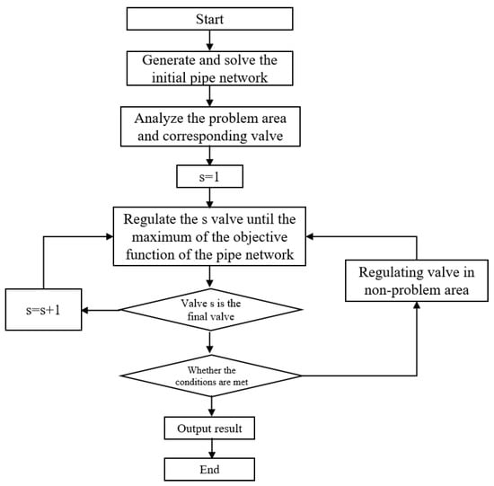 In gas extraction pipeline network regulation, it is reasonable to achieve local optimization of the objective function while minimizing the number of valves being adjusted. The method proposed here first adjusts the valve openings in the problematic area of the extraction pipeline network to optimize the extraction conditions in that area. Then, it sequentially adjusts valve openings in other areas to mitigate the extraction impacts caused by the regulation of the problematic area. Following this, the valve openings in the problematic area are fine-tuned again to achieve optimal performance. This cycle repeats until the entire pipeline network operates under optimal conditions and converges. The flowchart for the mine gas extraction pipeline network regulation process is shown in Figure 12. It is undeniable that our current optimization approach has certain limitations. In future research, we plan to incorporate deep learning theories, such as artificial neural networks [34], to enhance the optimization process.