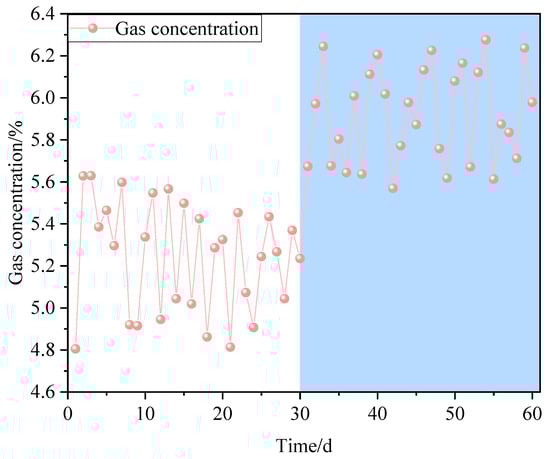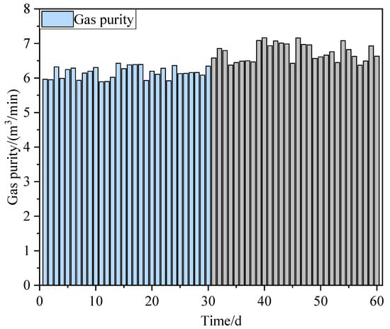The control effect is shown in Figure 14 and Figure 15. Before the regulation, the gas concentration in the main pipeline of the extraction network was maintained at around 5.3%. After the adjustment, continuous observation of the extraction negative pressure in the main pipeline was conducted for a month, resulting in a gas extraction concentration of approximately 5.9%, representing an average increase of 11%. Gas concentration is not the sole indicator for evaluating the effectiveness of gas extraction. While ensuring an increase in concentration, it is also crucial to ensure that the pure gas extraction volume does not decrease. Before the regulation, the gas extraction pure volume in the main network was maintained at around 6.3 m3/min. After the implementation of intelligent control, the gas extraction pure volume was maintained at around 6.6 m3/min, representing an increase of 0.3 m3/min, thus achieving a positive outcome.