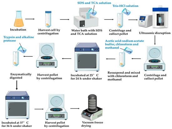 The pellet was resuspended in 4% (w/v) sodium dodecyl sulfate (SDS) and boiled for 5 min. After centrifugation (8000× g, 20 min), the pellet was treated with 15% (w/v) trichloroacetic acid (TCA) at a 1:10 (w/v) ratio, incubated in a water bath (100 °C) for 30 min, and immediately chilled. The TCA-treated residue was collected by centrifugation (8000× g, 20 min) and subjected to ultrasound (15 min) to fragment cell wall matrices. The pellet was washed three times with sterile ultrapure water under centrifugation (8000× g, 15 min).