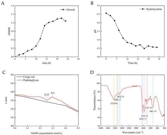 (A) The growth of Lactobacillus casei ATCC 393; (B) pH change during PG hydrolysis; (C) UV absorption spectrum of PG; and (D) FT-IR analysis of PG.