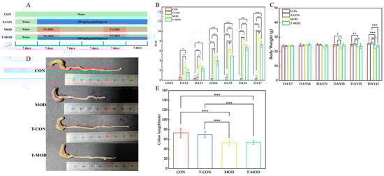 After 7 days of adaptation, the mice were randomly assigned to experimental groups using a computer-generated randomization schedule stratified by body weight to ensure equivalent baseline distributions across groups. The mice were initially randomly divided into four experimental groups (n = 10 per group): (1) the control group (CON), (2) the PG-feed control group (T-CON), (3) the dextran sulfate sodium salt (DSS)-induced group (MOD), and (4) the PG intervention group (T-MOD) [22]. The treatment of each group and the intervention strategy is shown in Figure 4A. During the 8–14 and the 29–35 days, 3% (w/v) DSS was added to the water for the MOD group and T-MOD group mice. After 7 days of adaptation, the T-CON group and T-MOD group were treated with PG. The dose of Lactobacillus casei ATCC 393-derived PG (100 mg/kg) was selected based on previous studies [13,23]. After a six-week intervention period, mice feces were collected for further analysis. Whole blood was collected and centrifuged to collect serum. Some tissues and serum were quickly transferred to a −80 °C freezer after being flash-frozen in liquid nitrogen.