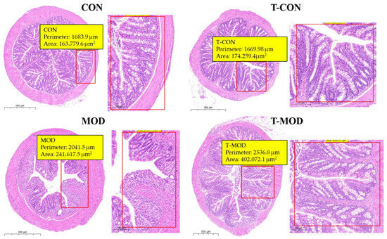 As previously reported, colon length serves as a reliable indicator of IBD severity, with colon shortening representing a hallmark symptom of colonic inflammation that can recover with disease remission [39]. The DSS-induced MOD group exhibited significantly shorter colon lengths compared to the CON group, consistent with findings reported by Cao [22] that DSS can induce clinical manifestations including weight loss and colon shortening in murine models. Notably, after PG intervention, mice in the T-MOD group demonstrated a protective effect against DSS-induced colon length changes than the MOD group. These results demonstrate that PG can effectively mitigate DSS-induced colitis to a certain extent.