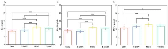 Inflammatory bowel disease has been associated with the upregulation of pro-inflammatory cytokines, including interleukin-6 (IL-6), interleukin-1β (IL-1β), and tumor necrosis factor-α (TNF-α) [22]. These cytokines, produced during active inflammation, emerge in the early stages of immune response and may initially serve protective functions against tissue damage. DSS-induced colitis can promote the excessive release of inflammatory cytokines, which subsequently stimulates inflammatory reactivity. Pathogenic microbes infiltrating the colon through a compromised intestinal barrier activate antigen-presenting cells (APCs), including dendritic cells and macrophages. Macrophages, through phagocytic activity, release pro-inflammatory cytokines such as IL-6, IL-1β, and TNF-α, thereby initiating and amplifying the inflammatory response [42]. To evaluate the prebiotic potential of PG in mitigating colitis severity, we quantified serum concentrations of these pro-inflammatory cytokines (IL-6, IL-1β, and TNF-α) following PG intervention. As shown in Figure 6, the MOD group showed significantly elevated cytokine levels compared to the CON group, which potentially reflects DSS-induced inflammatory responses and underlying immune dysregulation. Compared with the MOD group, the T-MOD group substantially reversed these increases, reducing IL-6, IL-1β, and TNF-α levels by approximately 7.0%, 7.6%, and 7.8%, respectively, relative to the MOD group. After PG intervention (T-MOD group), serum pro-inflammatory cytokine levels decreased, indicating that PG modulates cytokine expression to mitigate colitis. These quantitative reductions align with established mechanisms, wherein Lactobacillus-derived peptidoglycan modulates macrophage activity and suppresses NF-κB (nuclear factor kappa-B) signaling. These findings are consistent with those from Wu [32], confirming PG’s role in promoting anti-inflammatory mediator secretion while suppressing pro-inflammatory pathways. The robust effect sizes observed underscore PG’s potent immunomodulatory capacity in colitis mitigation.