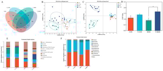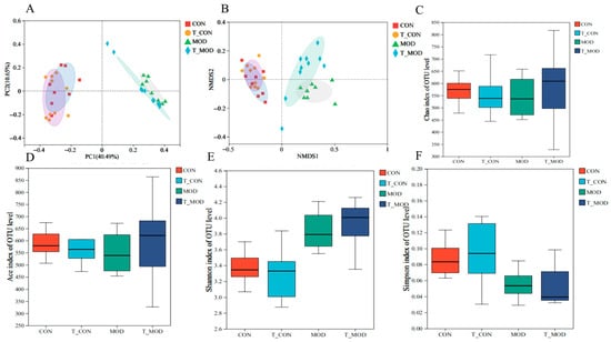 16S rRNA gene sequencing was performed on fecal samples from the CON, T-CON, MOD, and T-MOD groups. The detected gut microbiota were classified into 12 phyla, 19 classes, 49 orders, 82 families, 182 genera, 341 species, and 2269 operational taxonomic units (OTUs). Partial least squares discriminant analysis (PLS-DA) revealed structural differences in microbial communities among the CON groups, T-CON groups, MOD groups, and T-MOD groups. As shown in Figure 7, DSS-induced colitis increased microbial diversity, potentially due to disrupted intestinal barriers promoting the growth of pathogenic bacteria [43]. Principal coordinates analysis (PCoA) and non-metric multidimensional scaling (NMDS) of β-diversity at the OTU level (Figure 7A,B) revealed substantial overlap in microbial composition between the CON and T-CON groups, whereas the MOD and T-MOD groups exhibited distinct clustering patterns. This indicated that PG intervention had negligible effects on healthy mice but modulated gut microbial growth in colitis-induced mice to alleviate inflammation. The α-diversity of gut microbiota in colitis mice was evaluated using the Chao1, ACE, Shannon, and Simpson indices. The former two indices quantify microbial richness while the latter two assess diversity. As presented in Figure 7, the T-MOD group exhibited slightly higher Chao1 and ACE indices, reflecting enhanced microbial richness. The change in α-diversity observed in the MOD group was probably caused by DSS-induced inflammation, which promoted the proliferation of harmful gut bacteria, disrupted the balance of gut microbiota, and consequently reduced microbiota abundance. A high Shannon index and reduced Simpson index suggested that while colitis decreased microbial diversity, PG intervention effectively attenuated this reduction, maintaining gut microbial stability.