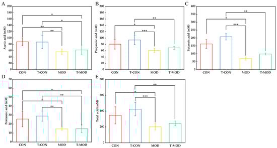 SCFA. The values are presented as the mean ± SD (n = 6). (A) Acetic acid. (B) Propanoic acid. (C) Butanoic acid. (D) Pentanoic acid. (E) Total acid. Statistics: Some samples were not detected. Statistics: * p ≤ 0.05, ** p ≤ 0.01, and *** p ≤ 0.001.