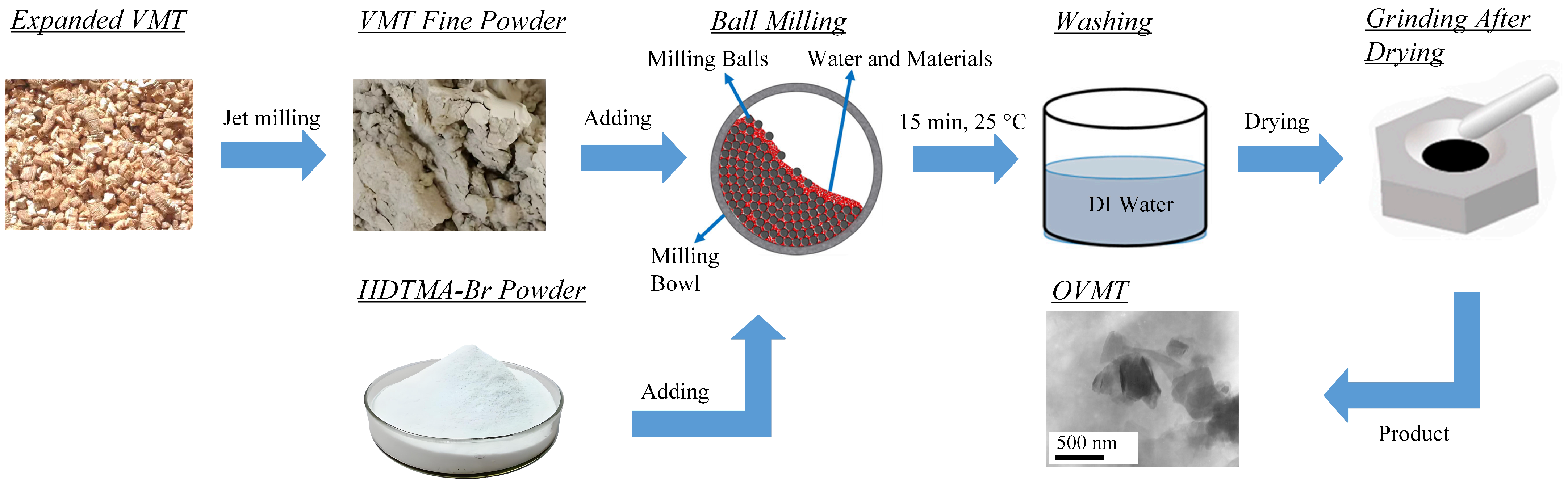 The raw VMT used in this study consisted of coarse granular particles with typical sizes of approximately 2–3 mm, as visually inspected. To obtain a fine powder suitable for intercalation, the material was first ground using an airflow pulverizer (Model QS50, Shanghai Chemical Machinery No. 3 Factory, Shanghai, China). Approximately 30 g of VMT and 8.1 g of HDTMA-Br (equivalent to 1 CEC) were dispersed in 200 mL of deionized water under constant stirring to form a homogeneous suspension. The suspension was subsequently subjected to planetary ball milling (Model QM-ISP2, Nanjing University Instrument Plant, Nanjing, China) at a rotational speed of 450 r/min for 15 min. A schematic diagram of the preparation procedure is provided in