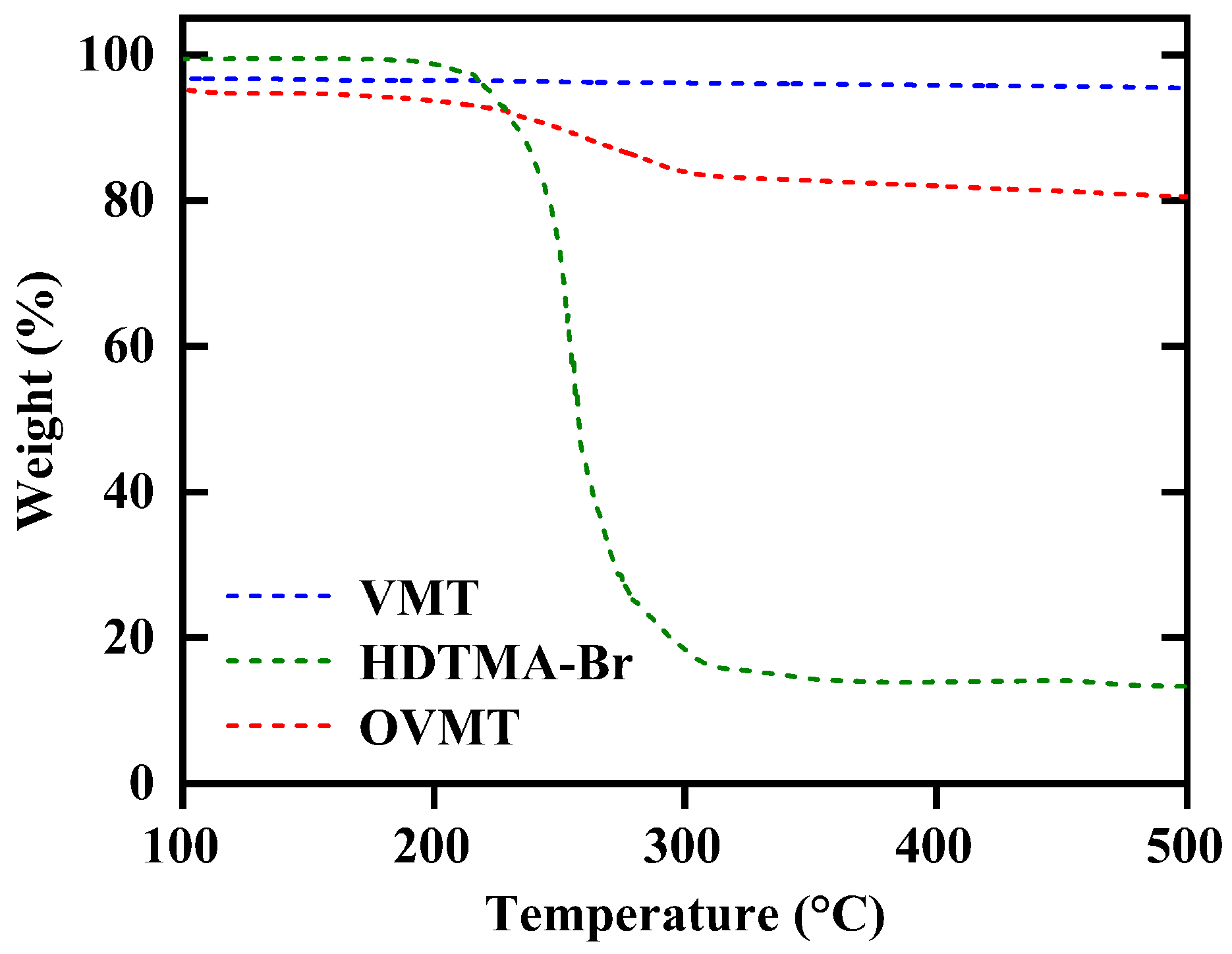 Figure 5. The weight loss of HDTMA-Br occurs between 180 °C and 320 °C, which corresponds to the thermal decomposition of its alkylammonium chains. For VMT, only a minor mass loss of approximately 3% is observed at low temperatures (<180 °C), attributable to the release of physisorbed and interlayer water.