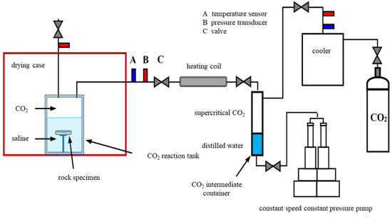 To accurately simulate the CO2–water–rock interaction in the reservoir temperature–pressure–fluid coupling environment, experiments were carried out using an integrated high-temperature and high-pressure immersion system. This system consists of a high-purity gas source unit (Yongan Special Equipment Co., Ltd., Linyi, Shandong, China), a high-precision constant-speed constant-pressure pump(Jiangsu Lianyou Scientific Research Instrument Co., Ltd., Haian, Jiangsu, China), a buffer intermediate container (Weihai Borui Chemical Machinery Co., Ltd., Weihai, Shandong, China), a CO2 preheating module, a Hastelloy alloy reactor(Weihai Borui Chemical Machinery Co., Ltd., Weihai, Shandong, China), a constant temperature box (Kington Technology Co., Ltd., Chongqing, China), a drying box (Kington Technology Co., Ltd., Chongqing, China), and a temperature and pressure sensing system [32] (Figure 4).