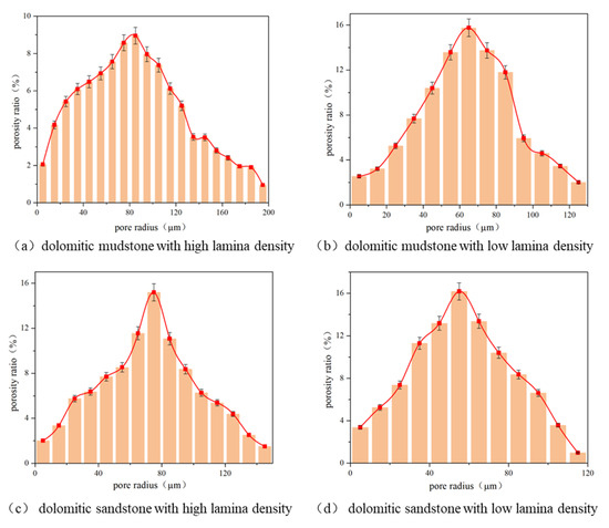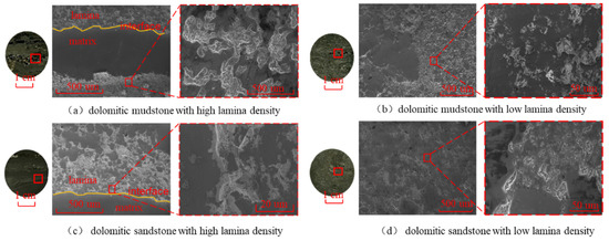 The microstructure of different lithologies and regions observed under a scanning electron microscope is shown in Figure 6. The initial pore structure distribution of rocks is affected by lithology (mineral composition) and lamina structure (mineral distribution). The dolomitic rock with high lamina density presents a layered structure, with the lamina and the matrix alternately arranged, and the microscopic pore structure is centered on the layered heterogeneity (Figure 6a,c). The lamina region is rich in carbonate minerals, and its pore structure is mainly composed of intergranular pores of carbonate minerals and interlamellar pores within the lamellar region [33,34]. The intergranular pores of carbonate minerals present as regular polygons, formed in the gaps between crystals that have not been filled or retained in the gaps after slight deformation of the crystals. The interlayer pores within the lamina are parallel to the direction of the lamina. They are formed when the minerals within the lamina are arranged directionally and are not completely compacted between layers [35]. The surface of the dolomitic mudstone with high lamina density (Figure 6a) clearly shows a distinct boundary between the lamina area and the matrix area. The surface of the matrix is dense and smooth, without obvious pores or cracks. There are tiny pores with a pore radius of approximately 3 to 100 µm and a coordination number of about 2 to 3 within the lamina region. The micro-pores of dolomitic sandstone with high lamina density mainly exist in the distribution areas of some carbonate minerals in the lamina area (Figure 6c). The mineral particles of dolomitic rocks with low lamina density are evenly distributed. The microscopic pore structure is mainly intergranular pores, and there are no obvious micro-cracks (Figure 6b,d). In the carbonate-rich areas, there are intergranular connected pores with a pore radius of 2 to 50 µm in the dolomitic mudstone with low lamina density. In the quartz and feldspar mineral crystals, there are a small number of intragranular pores with a radius less than 20 µm. The overall pore distribution is relatively dispersed. The dolomitic sandstone with low lamina density forms large intergranular pores (with a radius of approximately 30 µm) at the junctions of different mineral particles, while smaller intergranular and intragranular pores form between the same mineral particles, and the connectivity between the pores is poor.