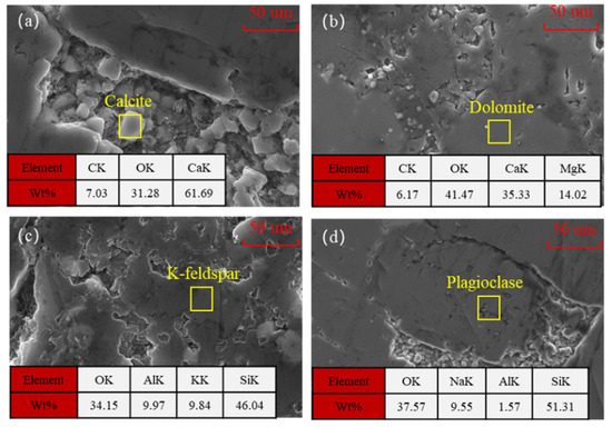 The microstructure and elemental characteristics of the main minerals in the rock were observed under a scanning electron microscope, as shown in Figure 7. Calcite presents a regular polyhedral crystal form (Figure 7a), with a smooth and dense crystal surface. It is a typical hexagonal crystal system of carbonate minerals and has high symmetry. In the crystal structure, Ca2+ and CO32− are combined by ionic bonds to form a layered structure. The crystals are intergranular, and the boundaries between the particles are clear. The pores formed are mainly intergranular pores caused by insufficient diagenetic cementation or slight compaction deformation [36]. Dolomite has a rhombohedral shape and belongs to the trigonal crystal system. Its crystals are relatively small and may mix with other minerals. The crystal structure of dolomite is composed of alternating Ca2+ and Mg2+, forming a layered structure. The bonding strength of Mg2+ is higher than that of calcium ions, making the crystal structure more stable [37,38]. Potassium feldspar appears in columnar or plate-like shapes, usually with smooth crystal planes and distinct edges. It belongs to the monocline crystal system and has a relatively dense overall structure, with intragranular pores mainly formed by crystal growth defects and intergranular pores as a supplement. Its main element identification feature is potassium. Sodium feldspar and potassium feldspar have similar crystal shapes, presenting as plate-like or slender columnar forms. They belong to the triclinic crystal system. Their pore structure is mainly intergranular pores and supplemented by intragranular pores. The main element identification feature is sodium. Based on the analysis of the crystal structure and physical properties of the four minerals, under high-temperature, high-pressure, and acidic environmental conditions, the stability of the four minerals is sodium feldspar > potassium feldspar > dolomite > calcite.