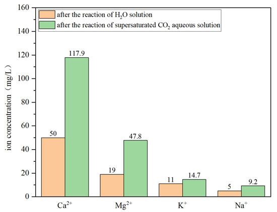 The mineral composition changes of core powder in the lamellar region of dolomitic mudstone with high lamina density before and after reaction in pure water solution and supersaturated CO2 aqueous solution are shown in Figure 8. The change in mineral composition after the reaction in the supersaturated CO2 aqueous solution is significantly greater than the reaction result in the pure water solution. After the reaction in the supersaturated CO2 aqueous solution, the relative content of calcite decreased from 50.2% before the reaction to 43.5%, and the relative content of dolomite decreased by 1.1%. In contrast, the relative content of calcite in the pure water solution decreased by only 2.2%, and that of dolomite decreased by only 0.9%. The corresponding ion concentrations produced are shown in Figure 9. After the reaction, the ion concentrations in the supersaturated CO2 aqueous solution are all higher than those in the pure water solution, among which the concentrations of Ca2+ and Mg2+ differ the most. The concentration of Ca2+ produced after the reaction in the supersaturated CO2 aqueous solution reached 117.9 mg/L, and the concentration of Mg2+ reached 47.8 mg/L, while in pure water solution, the concentration of Ca2+ produced after the reaction was only 50 mg/L, and the concentration of Mg2+ reached 19 mg/L. In contrast, the concentrations of Ca2+ and Mg2+ produced after the reaction in pure water solution decreased by 57.6% and 60.3%, respectively. At the same time, the surface micro-morphologies after the reaction between the original state and the pure water solution and the supersaturated CO2 aqueous solution were compared and observed as shown in Figure 10. After the reaction in the pure water solution, only some slight hydration corrosion occurred on the core surface, the overall structure was nearly complete, and the pore changes were relatively small. After reacting in a CO2 aqueous solution, the mineral particles on the core surface underwent significant dissolution and corrosion, making the surface rough and uneven.
