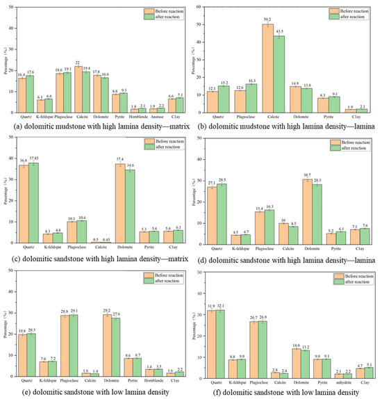 The mineral composition of the cores from four different lithologies and different regions before participating in the CO2–water–rock reaction is shown in Figure 5, and the error range is approximately ±2%. The dolomitic mudstone with high lamina density is mainly dominated by carbonate minerals (calcite, dolomite) and terrigenous clastic rocks (plagioclase, quartz), containing a small amount of pyrite, clay minerals, and trace amounts of amphibole and anatase. The dominant mineral in the lamina area is calcite (50.2%), followed by dolomite (14.9%), plagioclase (12.6%), quartz (12.1%), and a small amount of pyrite (8.3%) and clay minerals (1.9%). The mineral distribution in the matrix area is balanced. The contents of calcite, dolomite, plagioclase, and quartz are relatively close (16.4–22%), and the content of clay minerals is slightly higher (6.6%). The K-feldspar, hornblende, and anatase are completely distributed in the matrix area. The main minerals of dolomitic mudstone with low lamina density are dolomite (29.2%) and plagioclase (28.8%), and the secondary mineral is quartz (19.8%), containing a small amount of K-feldspar, pyrite, and hornblende. The content of calcite and clay minerals is very small, accounting for 1.6%, respectively. The dolomitic sandstone with high lamina density is mainly composed of quartz and dolomite, with their relative contents both reaching over 30%. It is followed by plagioclase and contains small amounts of calcite, potassium feldspar, pyrite, and clay minerals (all with contents around 5%). Compared with the matrix area, the content of quartz and dolomite in the lamina area is lower than that in the matrix area, and the content of plagioclase and clay minerals is relatively high, while calcite is almost all enriched in the lamina, and the matrix area contains only 0.5%. The dolomitic sandstone with low lamina density contains a large amount of quartz and plagioclases, which account for 58.6% of the total. It is followed by dolomite, pyrite, potassium feldspar, and clay minerals, with calcite content being relatively low, accounting for only 2.8%. By comparing the contents of mineral components in four different lithologies, it is found that the carbonated mineral content of dolomite rock with high lamina density is higher than that of dolomite rock with low lamina density, and the content of quartz and silicate minerals is lower than that of dolomite rock with low lamina density. The mineral composition contents of different lithologies and regions indicate that lithology determines the dominant mineral types, and the density of the lamina controls the mineral distribution. The lamina region exhibits targeted enrichment of dolomite, whereas the matrix region has a relatively higher content of quartz minerals.