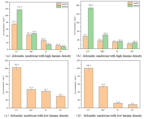 For the relative content changes of mineral components (Figure 11) and ion concentration changes (Figure 12) of core powders of different lithology and different regions before and after the CO2–water–rock interaction, multiple experiments were conducted to ensure reliability. Finally, the data dispersion was expressed by the average value and error, with the error of mineral content being ±3% and the error of ion concentration being ±5%. After the CO2–water–rock reaction, a large amount of Ca2+ and Mg2+ were produced in the solution. Among them, the Ca2+ concentration produced by the dissolution of the four lithologies was greater than 100 mg/L except for the individual matrix area, and the Mg2+ concentration fluctuated around 50 mg/L. Meanwhile, the relative contents of calcite and dolomite before the reaction were compared. It can be found that its relative content has decreased significantly, indicating that a large amount of carbonate minerals (calcite, dolomite) has been dissolved. The concentrations of K+ and Na+ produced in the solution are relatively low; that is, potassium feldspar and sodium feldspar are dissolved in small amounts, and the overall reaction degree is small. Because the total mass of minerals decreases after the reaction, their relative contents increase slightly. Quartz and pyrite have relatively stable chemical properties, hardly react, or react very slowly, and their relative contents increase. The relative content of clay minerals increased slightly (0.2–0.6%). After the reaction, the concentrations of different types of ions in the solution generally showed Ca2+ > Mg2+ > K+ > Na+. At the same time, considering the degree of change in the relative content of minerals before and after the reaction, calcite > dolomite > potassium feldspar > sodium feldspar, it was found that the priority of reaction between different types of minerals and the CO2 aqueous solution was different, and the reaction sequence was calcite > dolomite > potassium feldspar > sodium feldspar, respectively. The main reaction minerals of the CO2–water–rock reaction are calcite and dolomite. The concentrations of Ca2+ and Mg2+ produced by the reaction of dolomite mudstone and dolomite sandstone are in the order of lamina area > dolomitic rock with low lamina density > matrix area. The relative content of calcite in the matrix area of dolomitic mudstone with high lamina density, the lamina area of dolomitic mudstone with high lamina density, and the dolomitic mudstone with low lamina density decreased by 2.6%, 6.7%, and 0.2%, respectively, and the relative content of dolomite decreased by 1.2%, 1.1%, and 1.6%, respectively. The relative content of calcite in the matrix area of dolomitic mudstone with high lamina density, the lamina area of dolomitic mudstone with high lamina density, and the dolomitic mudstone with low lamina density decreased by 0.05%, 1.5%, and 0.4%, respectively, and the relative content of dolomite decreased by 2.8%, 2.4%, and 0.8%, respectively. Based on the change of ion concentration and the decrease in relative content, it is found that the lamina area is mainly filled with calcite and dolomite, and the CO2–water–rock reaction of carbonate rocks in the lamina area is more intense, among which calcite dissolution is the most serious.