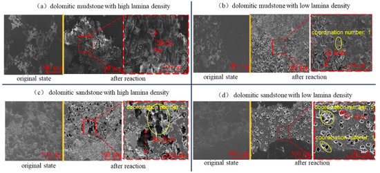 After the above reactions, the surface micro-pore structure and mineral composition of the cores with four different lithologies of dolomitic mudstone with high lamina density, dolomitic mudstone with low lamina density, dolomitic sandstone with high lamina density, and dolomitic sandstone with low lamina density changed significantly.