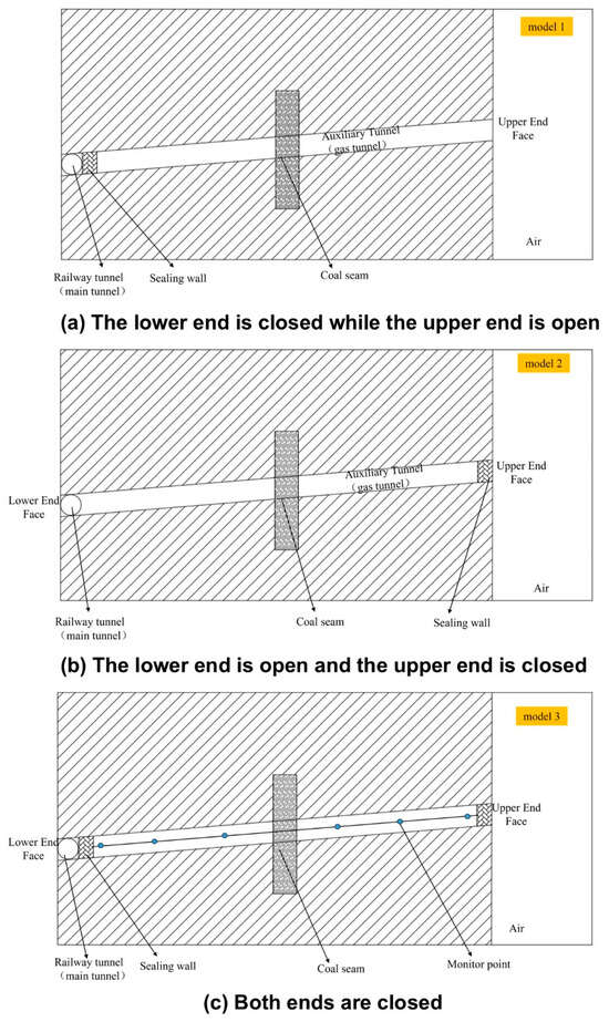 Referring to Figure 1, the numerical simulation focuses on the methane diffusion and methane explosion within an auxiliary tunnel that crosses through a coal seam. In this setup, the main tunnel is a railway tunnel that is operational and open for normal traffic, while the auxiliary tunnel (referred to as the cross tunnel) is constructed perpendicular to the main tunnel to support its operation. The auxiliary tunnel has already been excavated and completed. At the connection point between the auxiliary tunnel and the main tunnel, blocking walls have been constructed and sealed to ensure isolation. The upper face of the auxiliary tunnel is open to an external air domain. Three specific scenarios are investigated: (1) the lower face is sealed, while the upper face is open (model 1); (2) the lower face is open, while the upper face is sealed (model 2); (3) both the lower and upper faces are sealed (model 3). Figure 2 shows the schematic diagrams of three working conditions.