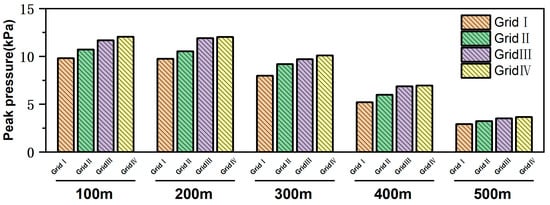 The grid was gradually refined through local and global refinement methods. During the grid refinement process, the expansion ratio of grid cells was maintained at approximately 1.5. Ultimately, four grid resolutions were generated. The grids were labeled Grid I-IV with cell counts of 752,637, 1,127,911, 1,694,531, and 2,541,322, respectively. Based on Model 2, the explosion situation of partially premixed methane (methane filling half of the roadway and the methane filling concentration is set at 9.5%.) in the roadway was taken as the standard for the grid independence test. The tunnel is 500 m long. Five pressure monitoring points were set up. Monitoring points 1–5 were located at distances of 500 m, 400 m, 300 m, 200 m and 100 m from the ignition point. Figure 4 shows that Grids I and II exhibit significant deviations from Grid IV, while Grid III results closely match those of Grid IV. Considering both computational accuracy and cost, Grid III was selected as the optimal grid for this study.