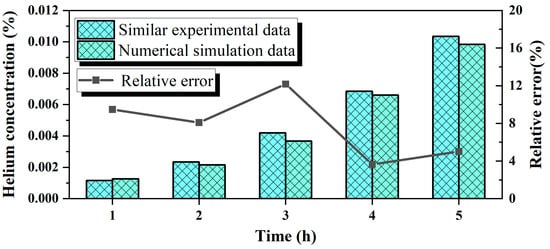 Figure 6 shows the concentration values measured by similar experiments and those monitored in the numerical simulation. The relative error between similar experiments and numerical simulation data ranges from 3.65% to 12.17%, with the majority of cases below 10%. This indicates that the numerical simulation results can explain the actual situation. At the same time, it can be reasonably deduced that the numerical simulation results remain accurate when the mixed gas is replaced with methane.