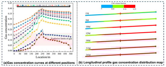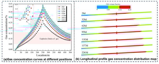 Figure 8 shows the methane concentration data and distribution map of Model 2. From Figure 8a, it can be seen that the methane concentration within the horizontal tunnel followed a pattern where the concentration was highest near the coal seam and gradually decreased toward both ends of the tunnel. On day 28, the methane concentration in the 100 m to 500 m region of the tunnel had already reached the explosion limit. Over time, the methane concentration in this region continued to rise, but the rate of increase gradually decreased. After 928 days, the methane diffusion in the tunnel reached a balanced state, with the methane concentration remaining almost unchanged. Eventually, except for the area near the coal seam, where the methane concentration remained above the explosion limit, the methane concentration in other areas of the tunnel fell within the explosion limit range.